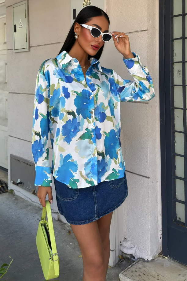 - Design features: Collared neckline, long sleeves with structured cuffs, straight hemline, and front buttons for closure.