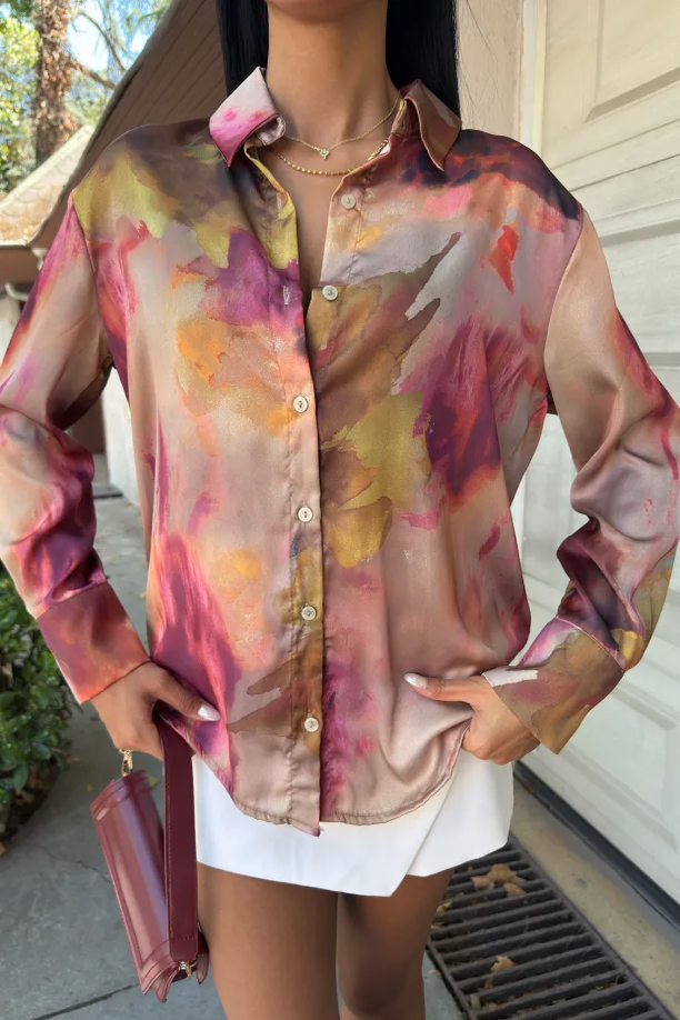 - Color & Pattern: The skirt is a solid white, while the blouse features an abstract watercolor pattern with blended tones of pink, red, purple, gold, and beige.