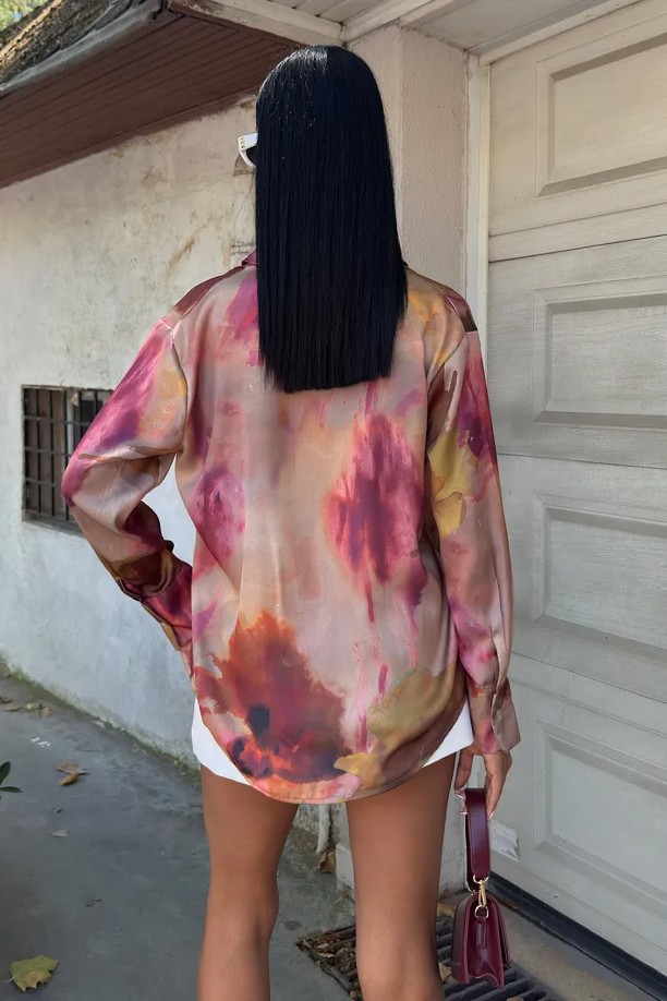 This mini dress is a stylish combination of a white A-line skirt and an abstract-patterned blouse. The skirt, in solid white, offers a clean and sophisticated look, while the blouse features an artistic blend of pink, red, purple, gold, and beige in an abstract watercolor pattern. The overall style is a perfect mix of bohemian-chic and tailored minimalism.