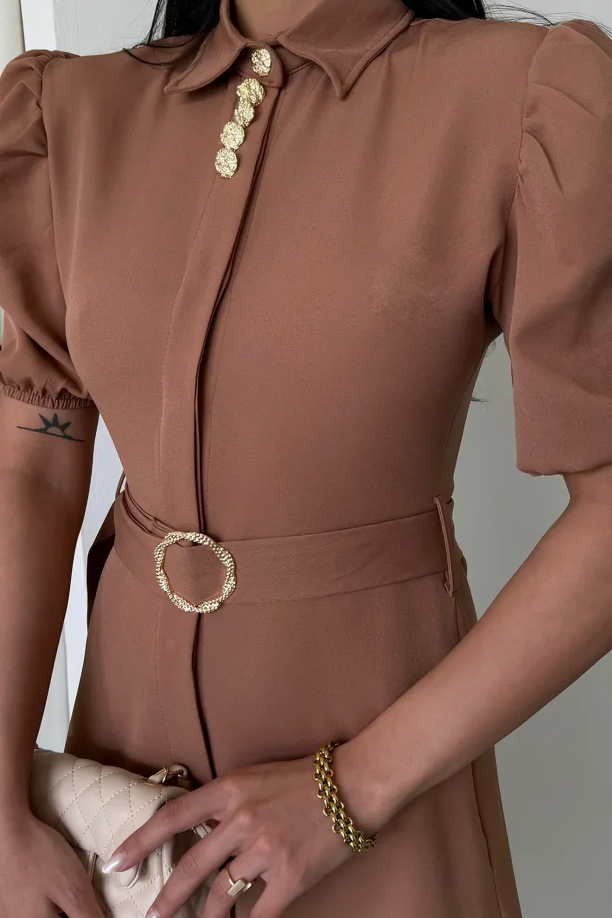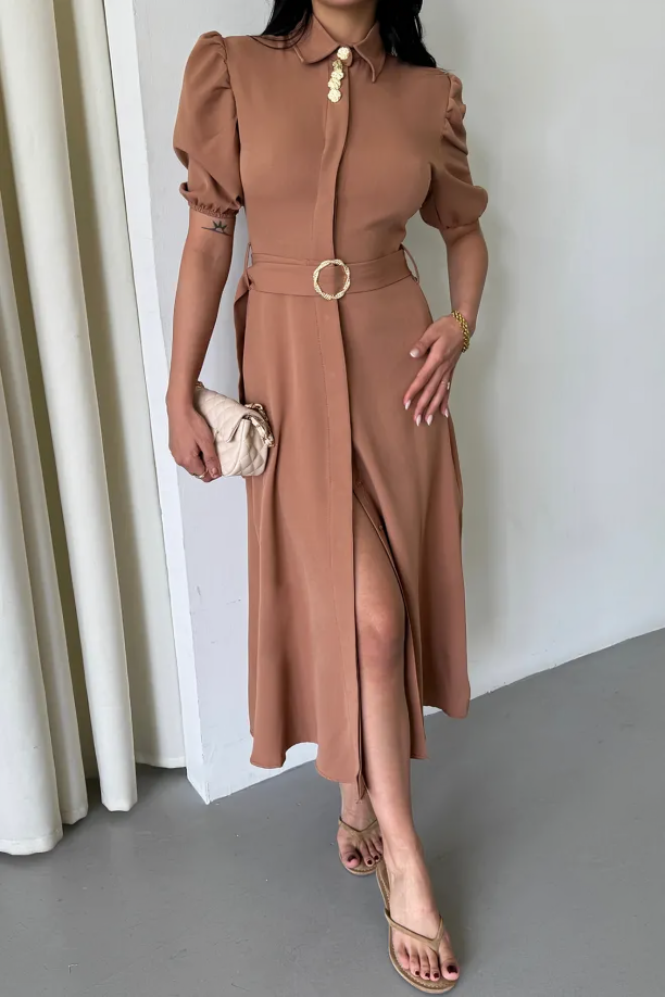 - Design features: Shirt collar (button – up style) with gold – tone buttons, short bishop sleeves, straight hemline with a high side slit, and a belted waist with a circular gold ring buckle.