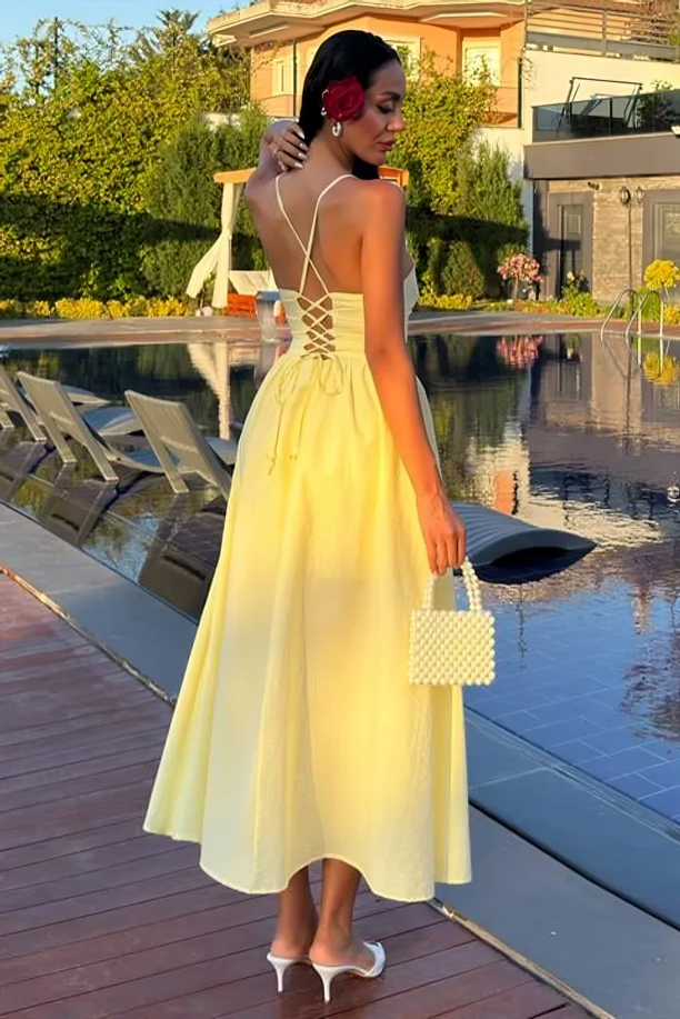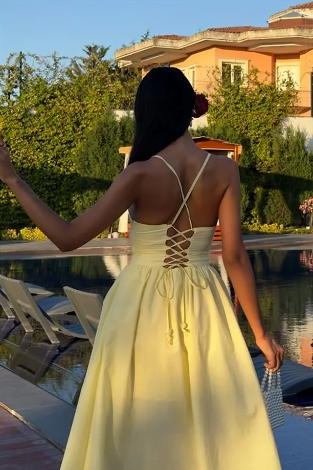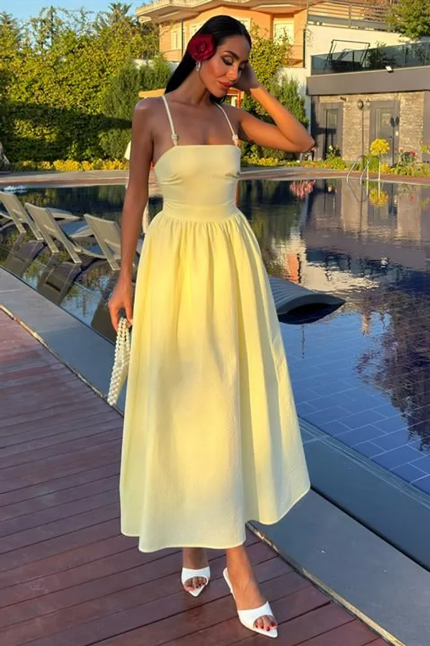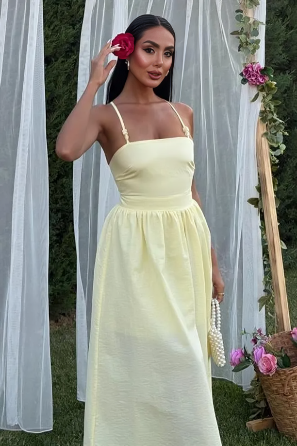 Step into elegance with this midi dress in a vibrant yellow hue. The square neckline with thin spaghetti straps and the A-line hemline create a classic and glamorous silhouette, perfect for sunny, upscale events.
