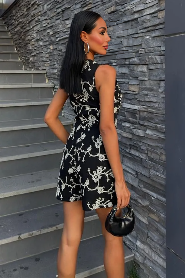This elegant mini dress features a solid black base adorned with delicate white floral motifs, creating a refined and intricate print. The structured V-neck and functional buttons along the front placket add a tailored, vintage-inspired touch, while the body-hugging silhouette and straight mini-hem create a streamlined, polished look.
