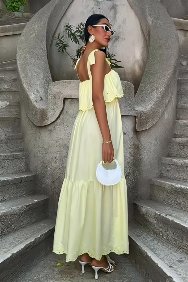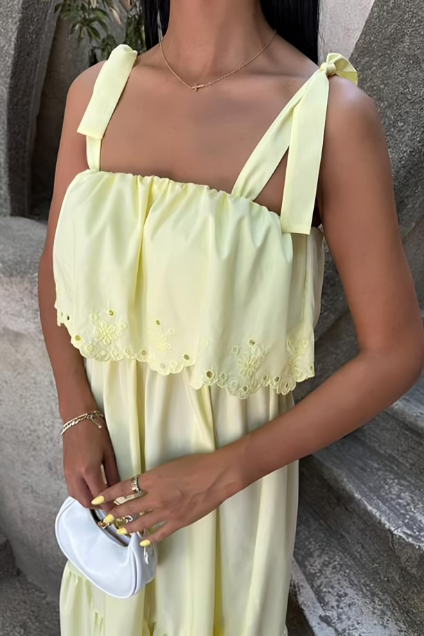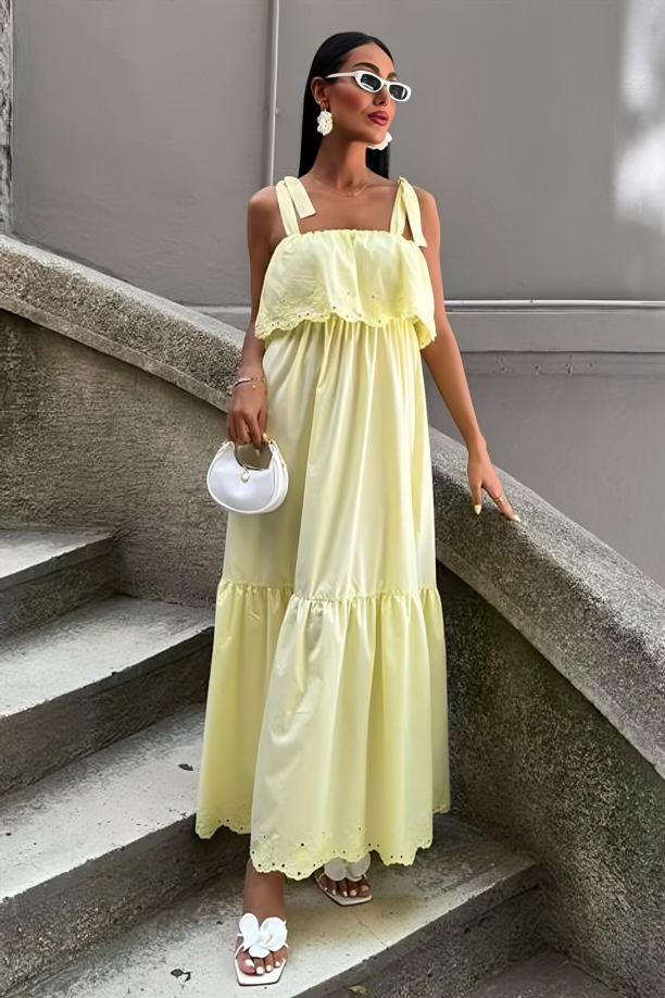 Step into a world of bohemian charm with this bright lemon yellow maxi dress. Crafted from lightweight cotton, it features a loose A-line silhouette and delicate eyelet lace trim, perfect for summer outings and beach vacations.