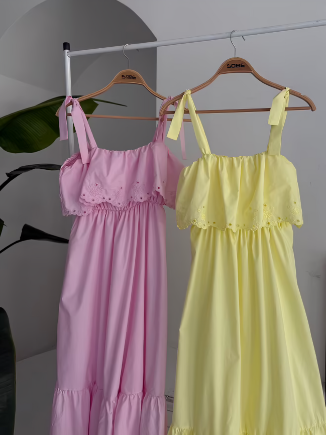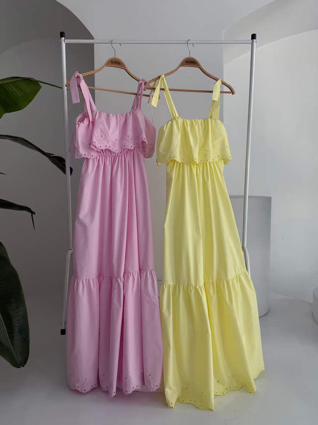 - Design features: Square neck with structured, gathered bodice, sleeveless with thin, adjustable shoulder straps, tiered A-line hemline with scalloped edges, eyelet lace trim along neckline and hem, and gathered tiers at waist and lower skirt.
