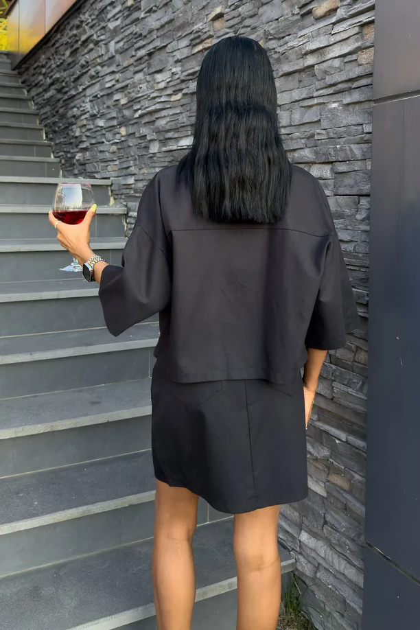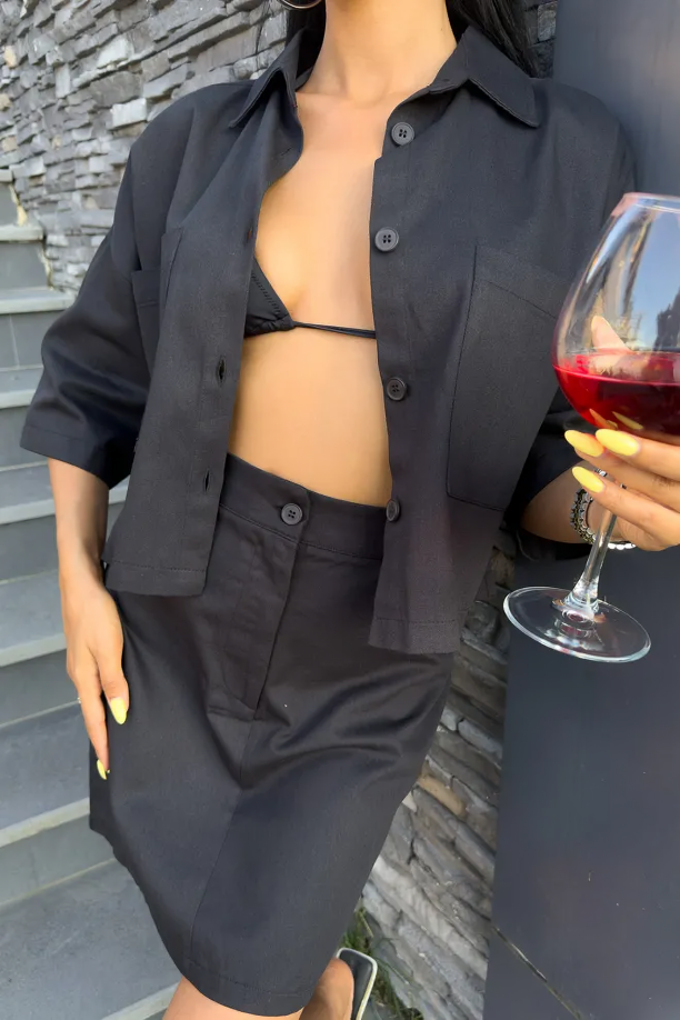 Introducing a sleek and contemporary black mini shirtdress. With its solid black color and minimalist design, it exudes a polished casual vibe. The structured fabric and sharp details like buttons and collars add an edgy sophistication to this modern piece.