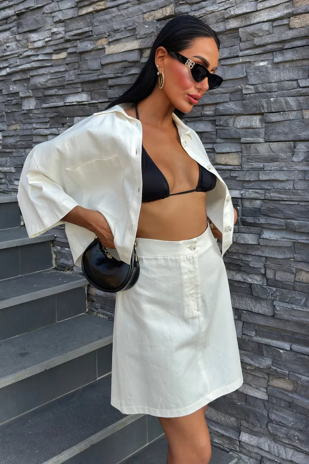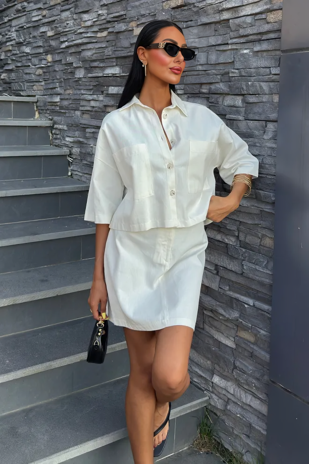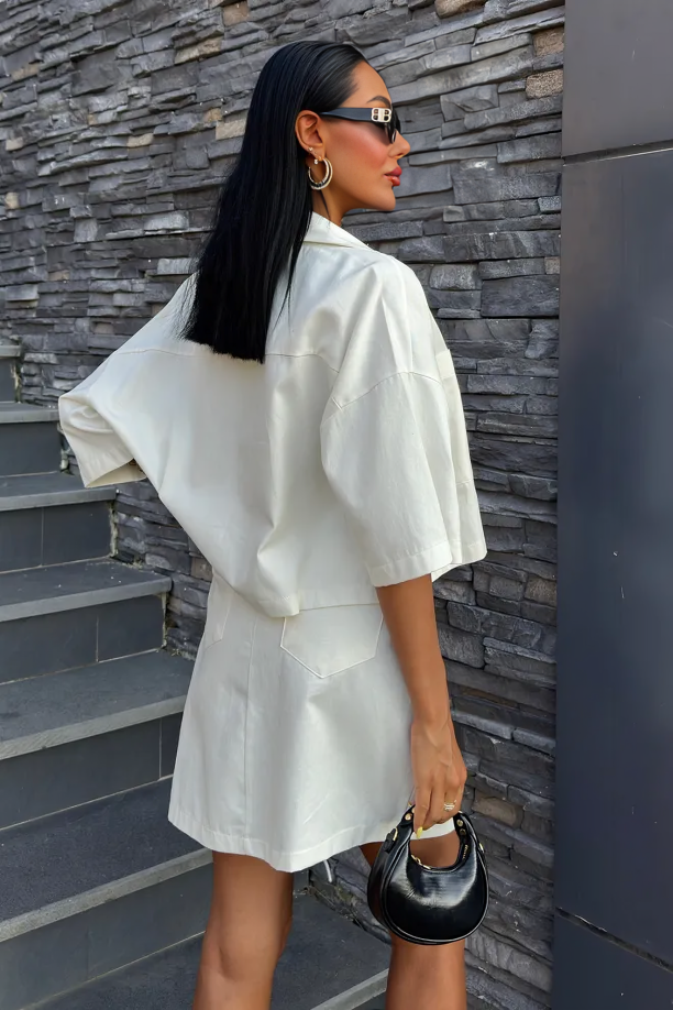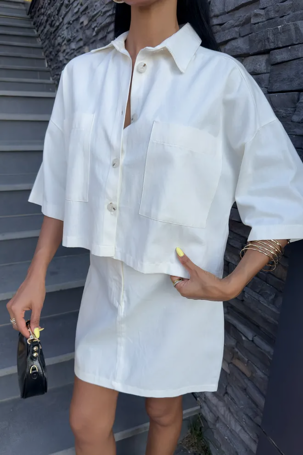 Introducing a stylish white mini dress that exudes casual – chic charm. Crafted from a matte, smooth, and slightly structured fabric, it features a collared neckline and short sleeves, offering a modern and minimalist look. The cropped shirt – style top paired with a straight – hemmed mini skirt creates a balanced and structured silhouette.